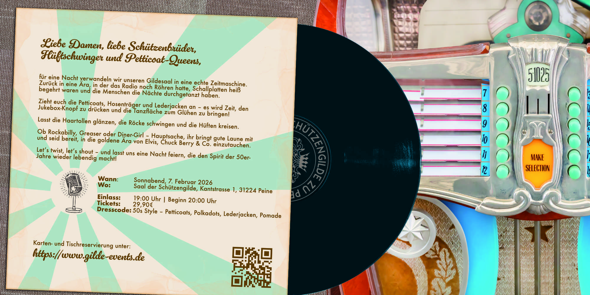 Das Wintervergnügen 2026 der Schützengilde Peine entführt euch in eine Ära, in der Musik aus knisternden Röhrenradios klang, Schallplatten mit Herzblut aufgelegt wurden und die Tanzflächen bis zum Morgengrauen bebten. Lasst den Alltag hinter euch, schlüpft in Petticoats, Hosenträger oder Lederjacken – und drückt den Jukebox-Knopf, als gäbe es kein Morgen. Die goldenen Zeiten warten auf euch!